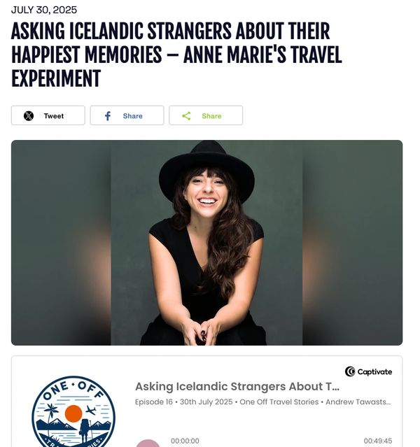 In this episode, Andrew sits down with Anne Marie Wells to hear about her solo hitchhiking trip across Iceland, where she spent weeks asking strangers one question: “What is your happiest memory?”. From there, she would venture out to visit the scene of the memory. Anne Marie shares the emotional highs and quiet moments that defined her trip and how curiosity and courage opened doors she never expected.